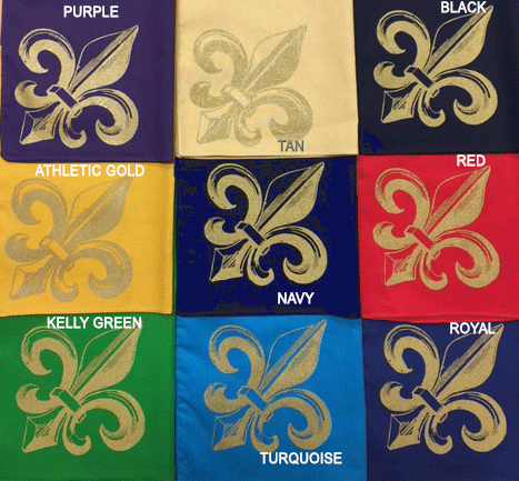 Perfect for the last minute Second-line event. Large Gold Fleur de lis printed in corner of a color 14 by 14 inch handkerchiefs. Sold in dozens. Order by the dozen. We have many pre-printed handkerchiefs in stock and can print very quickly if more are needed. You may mix handkerchiefs colors as long as they are ordered by the dozen and they will all look very nice with the Metallic gold ink. Use the drop down menu to help you choose your colors.