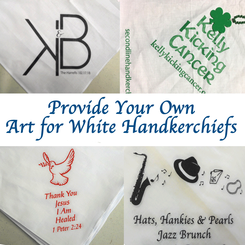 Supply your own ART.. and personalized Handkerchiefs By the Dozen. This option allows you to upload your personal custom design so that we can use it to print on your handkerchief. The art should be a one color image. The art must be copyright free. Please send your image as a .jpg, .eps or .pdf . The clarity of the art is very important to the printing process. This is perfect for the wedding couple or event planner who have had someone design a special image for their invitations or announcement and would like to use it on their handkerchiefs. The handkerchiefs are white 14" by 14”.. There is a minimum order of 4 dozen(48). Once you have filled out the areas below and placed your order you will receive a free black and white digital proof of your layout to be approved before printing.